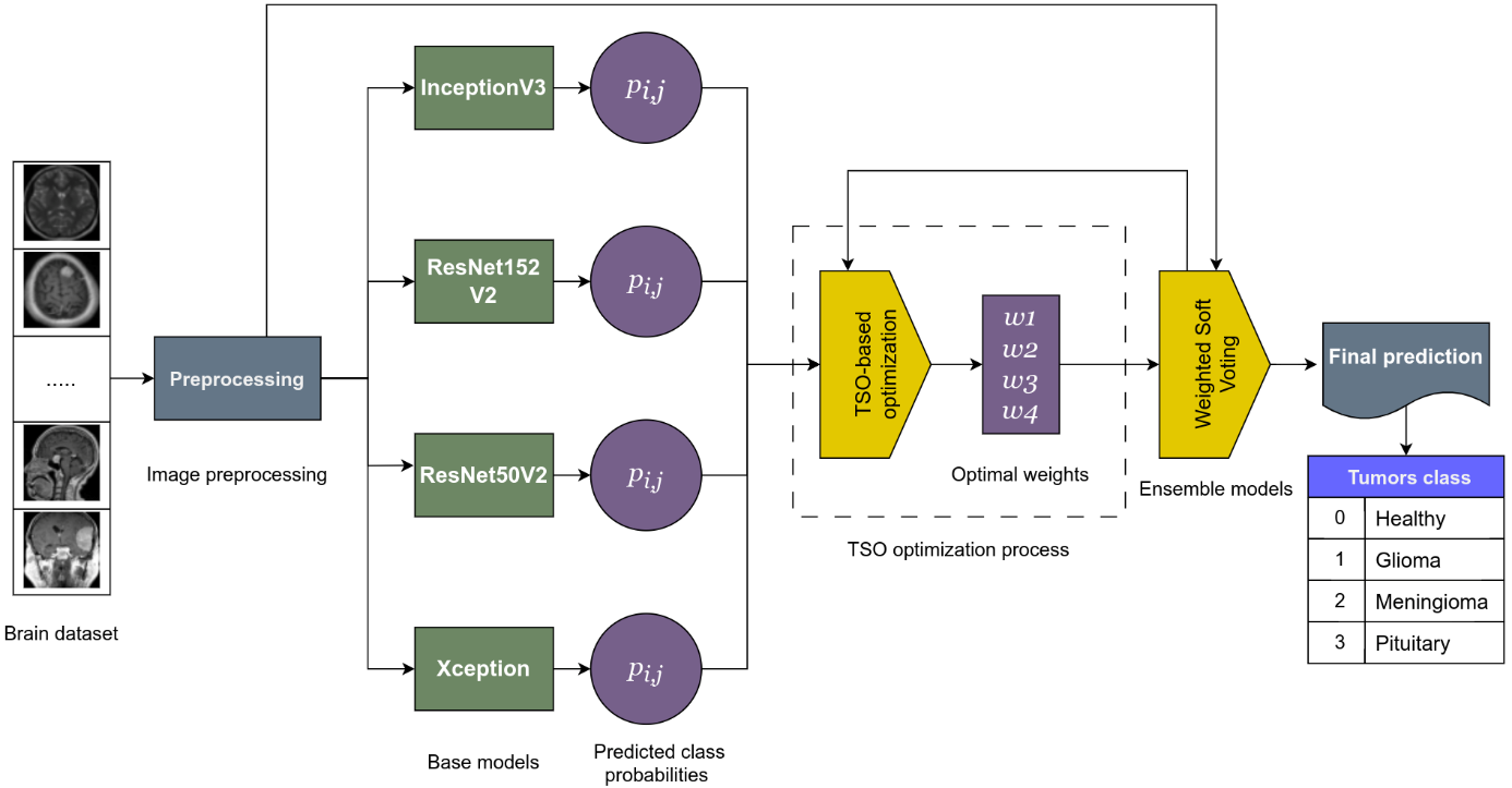 Early detection and accurate classification of brain tumors from MRI scans remain critical challenges in modern healthcare. This paper develops a novel hybrid approach that leverages Tuna Swarm Optimization (TSO) to optimize ensemble weights in a weighted soft voting framework for brain tumor classification. Our methodology applies TSO specifically to optimize the contribution weights of four pretrained Convolutional Neural Network architectures (InceptionV3, ResNet152V2, ResNet50V2, and Xception) in an ensemble framework. TSO, inspired by the collective hunting behavior of tuna fish, offers superior exploration capabilities and faster convergence than traditional optimization algorithms for weight optimization, while weighted soft voting enables probability-based integration of diverse model predictions. The proposed approach was trained and tested using a comprehensive dataset of 7,023 MRI images from the Nickparvar dataset, classifying brain scans into four classes: healthy, gliomas, pituitary tumors, and meningiomas. Transfer learning with fine-tuning was applied to the four pretrained CNN models, with TSO dynamically adjusting the ensemble contribution weights through spiral and parabolic foraging behaviors to minimize classification error. The weighted soft voting mechanism then combined these TSO-optimized weights with probability distributions to produce robust predictions. This hybrid TSO-optimized ensembleapproach achieved a validation accuracy of 99.92% and F1-score of 99.92%, superior to all individual models (best individual: ResNet50V2 at 99.69%) and conventional soft voting ensemble methods (99.85%). The optimized weight distribution prioritized ResNet50V2 (0.456) and Xception (0.342), demonstrating the algorithm’s ability to identify complementary model strengths. The improved performance and computational efficiency of the proposed framework position it as a promising clinical decision support tool for accelerating diagnosis processes and enhancing treatment planning in brain tumor assessment.DOI: